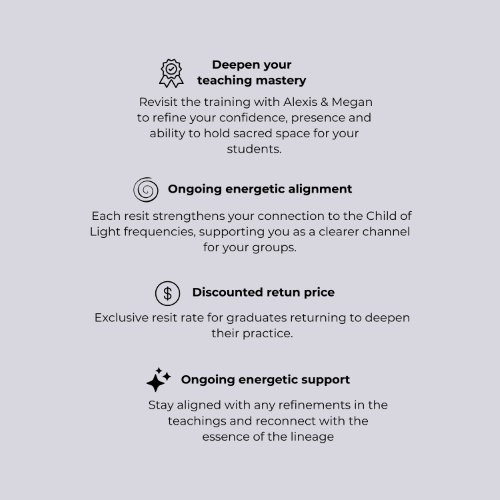 Led by Alexis and Megan, this module strengthens your embodiment of the fifth dimensional grid technology that underpins the Child of Light teachings. You’ll gain the insight, practical support and energetic alignment required to uphold the purity of this work, creating a safe and transformative space for others. Step into this role with integrity and heart, helping families and sensitive children navigate the new consciousness with greater ease, empowerment and understanding.